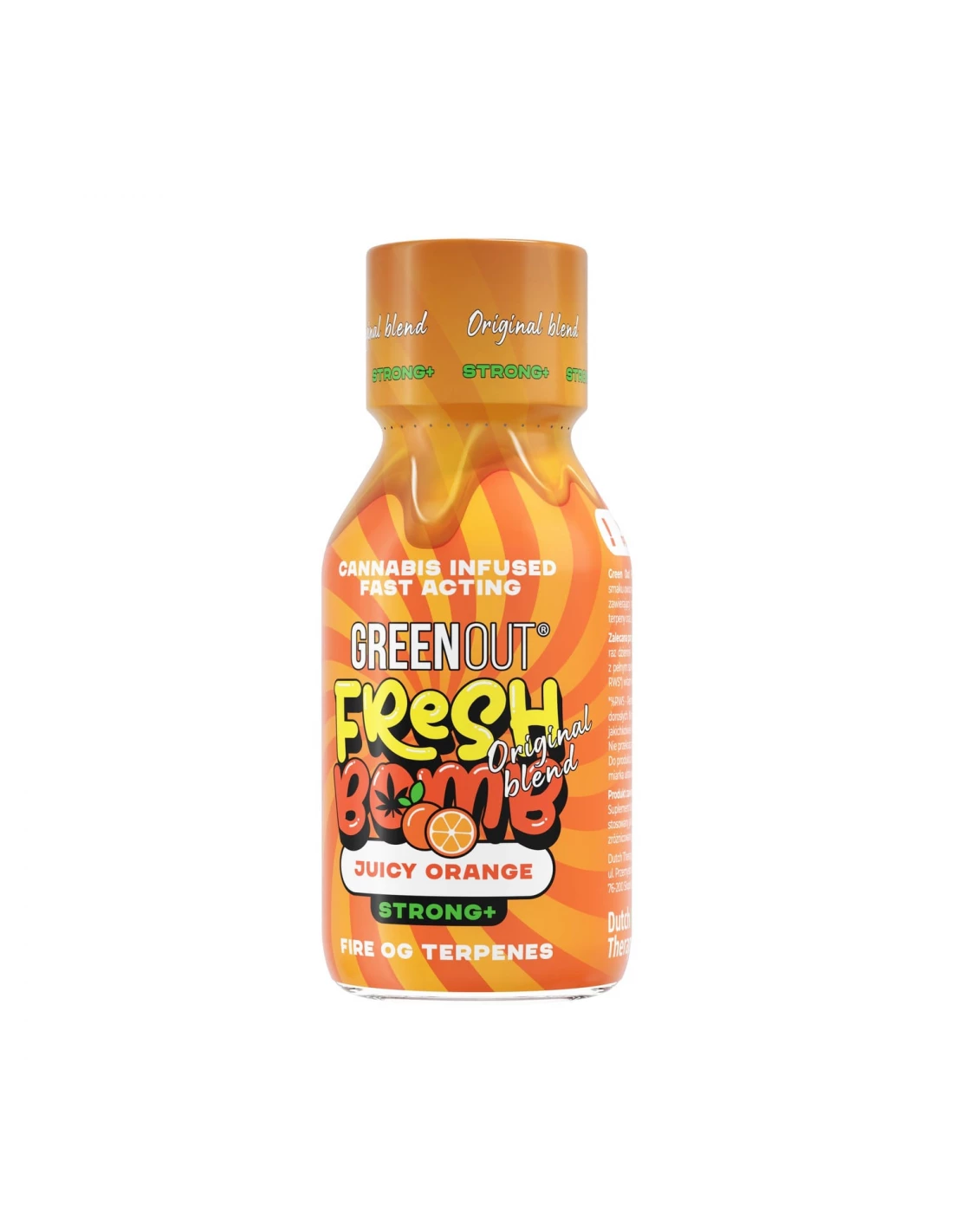 Green Out Fresh Bomb o smaku Juicy Orange to smaczny, owocowy suplement konopny o przyśpieszonym oraz poszerzonym działaniu, zawierający naturalne fitokanabinoidy, flawonoidy oraz profil terpenowy odmiany Fire OG. Jest to w 100% naturalny, legalny produkt a zarazem jedyny, o tak synergicznym działaniu. Pomoże zapewnić Ci stan relaksu oraz ulgę w występujących dolegliwościach. Wyprodukowany z najwyższej jakości olejku konopnego.
